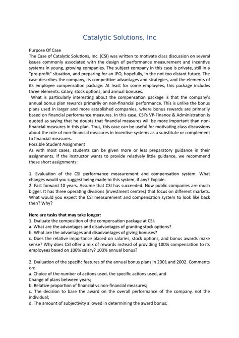 Read Catalytic Solutions Inc Case Study Doc online is a convenient and frugal way to read Catalytic Solutions Inc Case Study you love right from the comfort of your own home. Yes, there sites where you can get Doc "for free" but the ones listed below are clean from viruses and completely legal to use.